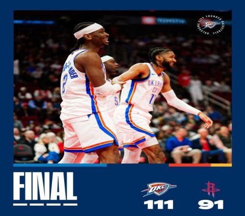 乌度卡请求暂停,随后出现技术犯规,亚历山大罚球命中。戴维森远投不进,亚历山大封盖谢泼德,随后4罚3中。距离终场不足3分球,火箭落后20分并换上板凳席末端的球员,休斯顿提前弃子认负,比赛就此失去了悬念。最终,雷霆以111比91完胜火箭。OKC本赛季双杀休斯顿,得以豪取5连胜。休斯顿单节16比34落后,末节崩盘。火箭此战91分创下了球队赛季得分的最低。此役,火箭抢下60个篮板,其中23个前场篮板,但3分球24投7中,外线疯狂打铁。雷霆全队44个篮板,其中前场篮板7个。