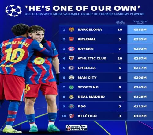 体育播报1月20日宣 德国转会市场统计了欧冠俱乐部之中自家青训球员的身价,并列出榜单,巴萨居首,阿森纳、拜仁前三。