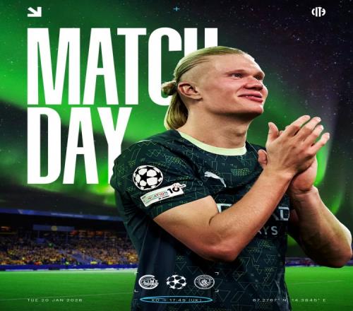 曼城官方社媒晒出为此役制作的海报,哈兰德出镜,背景为北极光下的阿斯普米拉体育场。